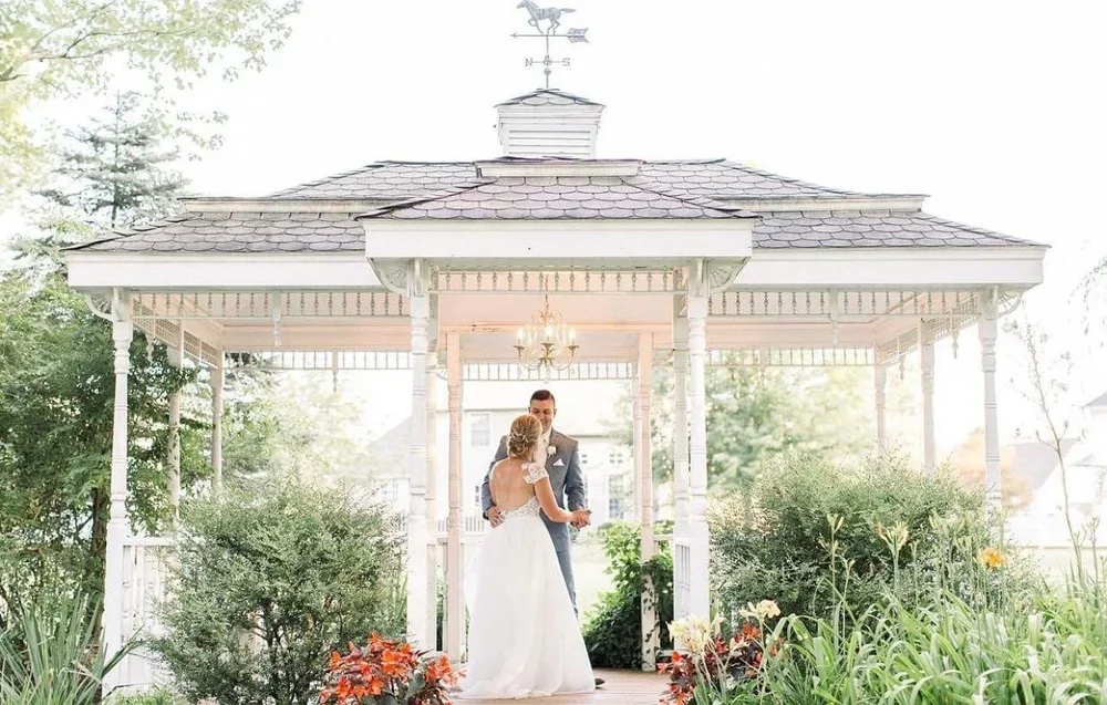 A newlywed couple sharing a kiss outdoors on grass, surrounded by trees and a white picket fence.
